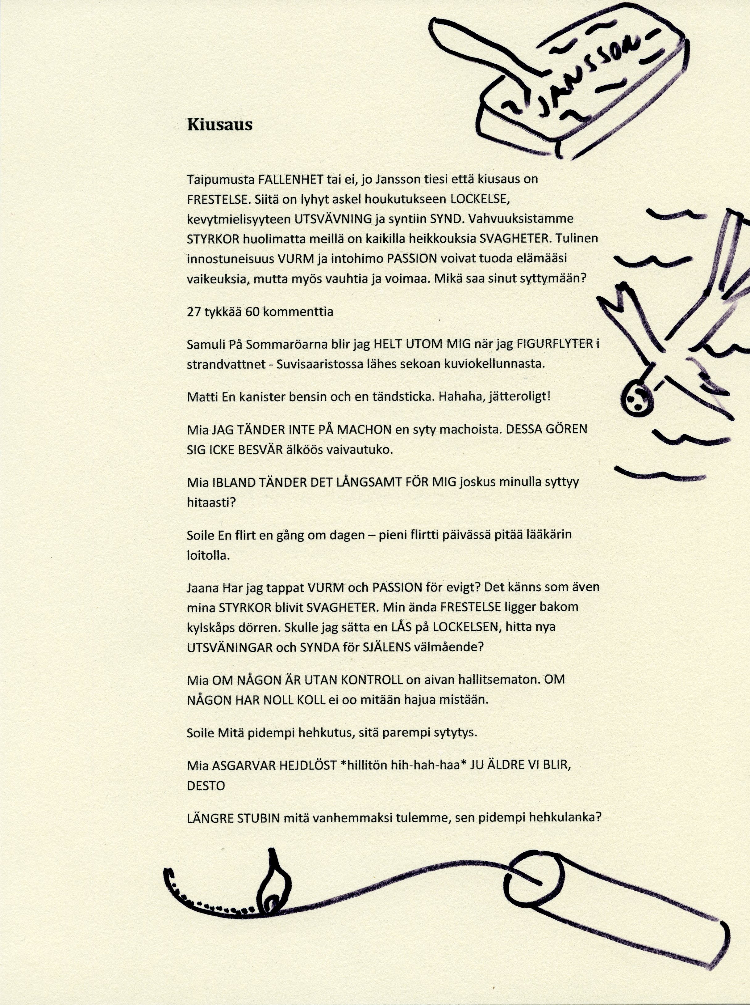 Jostain aina ilmestyy humoristi, kielitieteilijä, murreosaaja, kysyjä, historoitsija, opettaja, arkiajattelija, filosofi, tiukkis ja psykologi. Kieli on yhtä värikäs ja laaja kuin tapa, jolla sitä käytetään. Kommenttien kautta kieli elää ja suvaitsevaisuus kasvaa. Sen lisäksi kielen opettelu on hauskaa aivojumppaa!